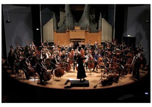 Direction d’un orchestre de contrebasses avec des élèves et des professeurs